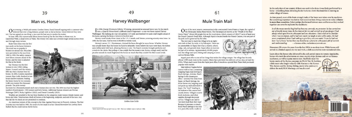 Horsestory III covers the years from the late 1920s to modern times. While horses still served in a limited capacity in war and work, a shift occurred to more recreational roles. Learn about the horses who delivered books and carried nurses to remote Appalachia, horses who took the adventurous on cross-country trips, famous and not-so-famous racehorses, as well as equine movie stars.